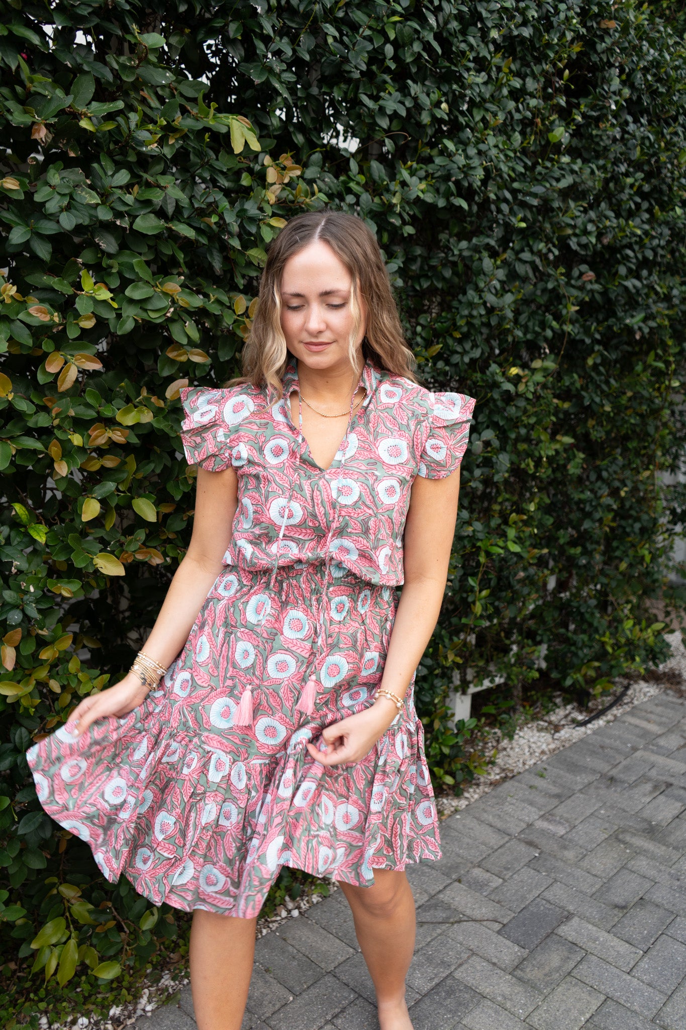 The Katherine is a gracefully stylish piece crafted from soft, breathable cotton with a hand-block printed eye catching pink and green floral pattern. This dress features a smocked waist, ruffle cap sleeve detail and a flattering v-neckline with tassel. It comes fully lined, ensuring you feel secure and confident wherever life takes you.